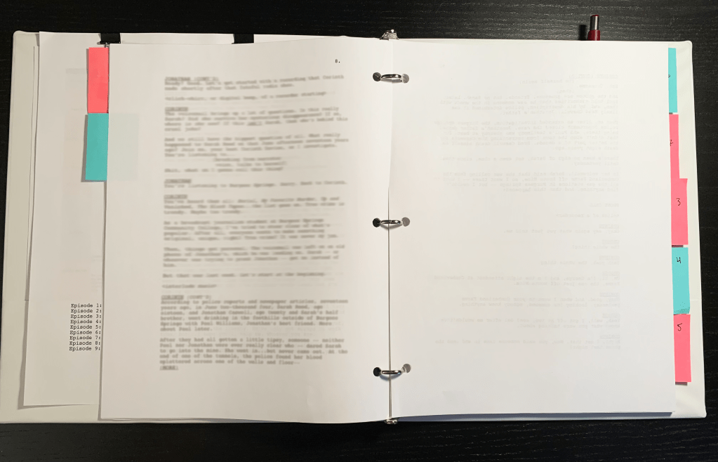 As we were recruiting voice talent for the show (*cough* begging our friends *cough*), I realized that I would want something with the whole season printed out, accessible in one location, so that I could make quick notes about different takes, line reads, thoughts for the edit, etc. And yes, I know that I could take notes or make highlights in Acrobat, but I needed something I could write on quickly, and for me no digital solution yet beats the hand-eye connection.